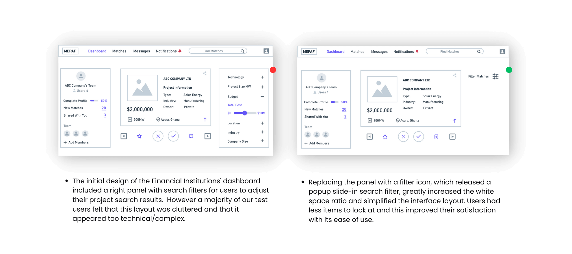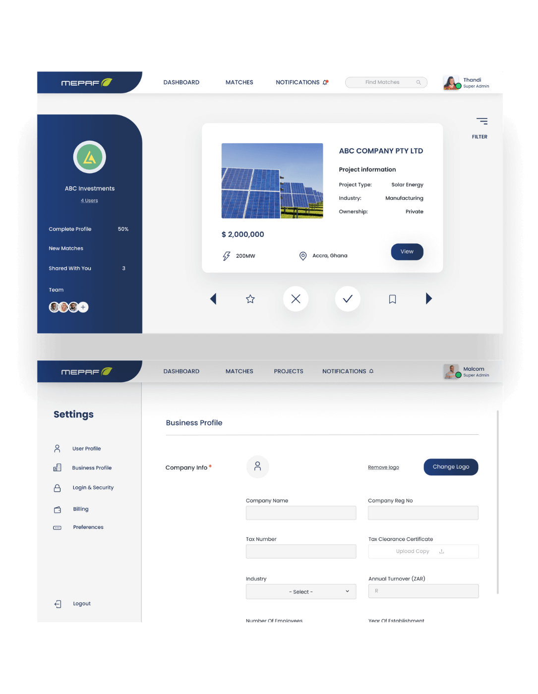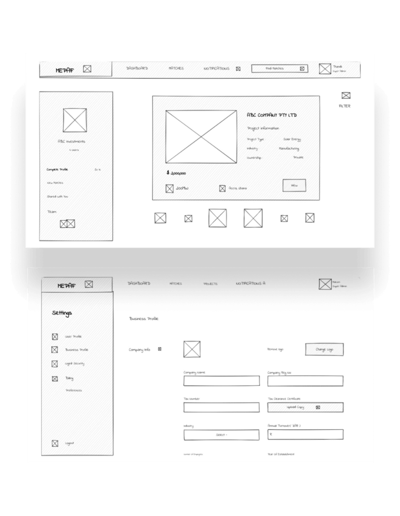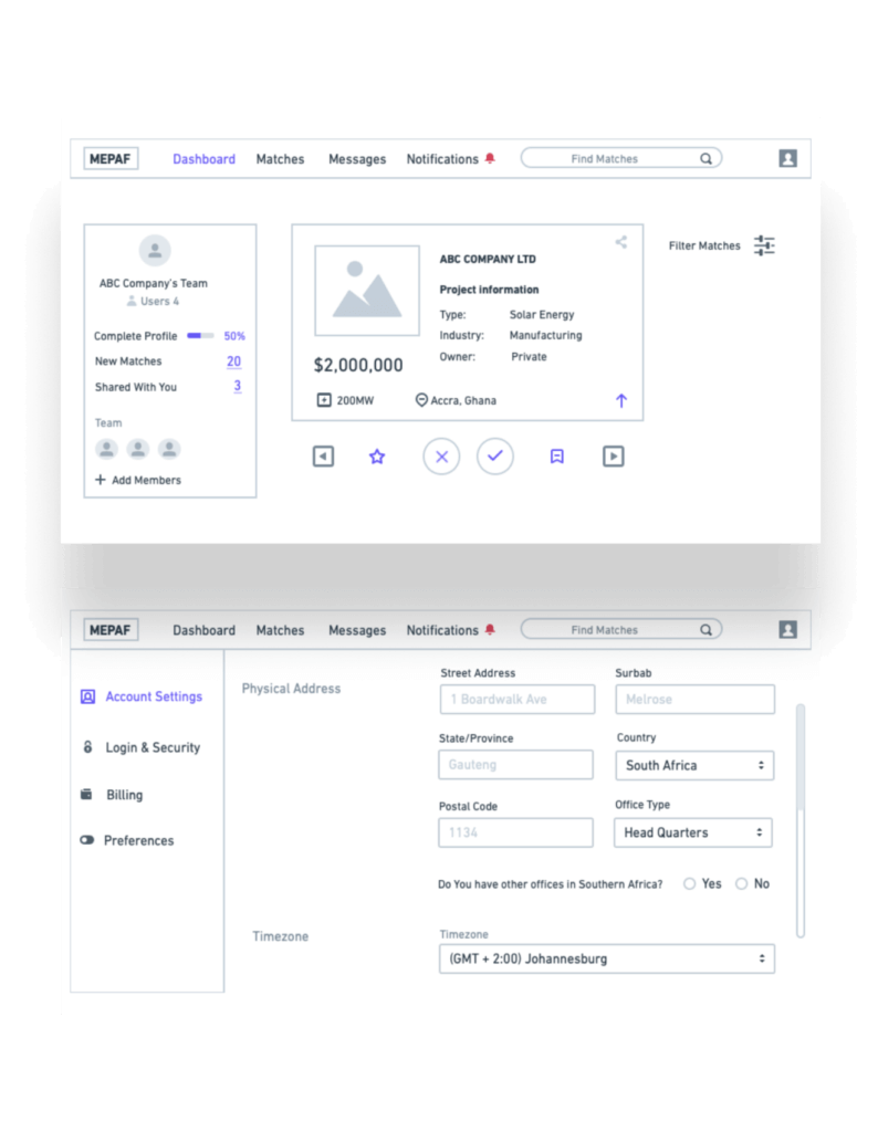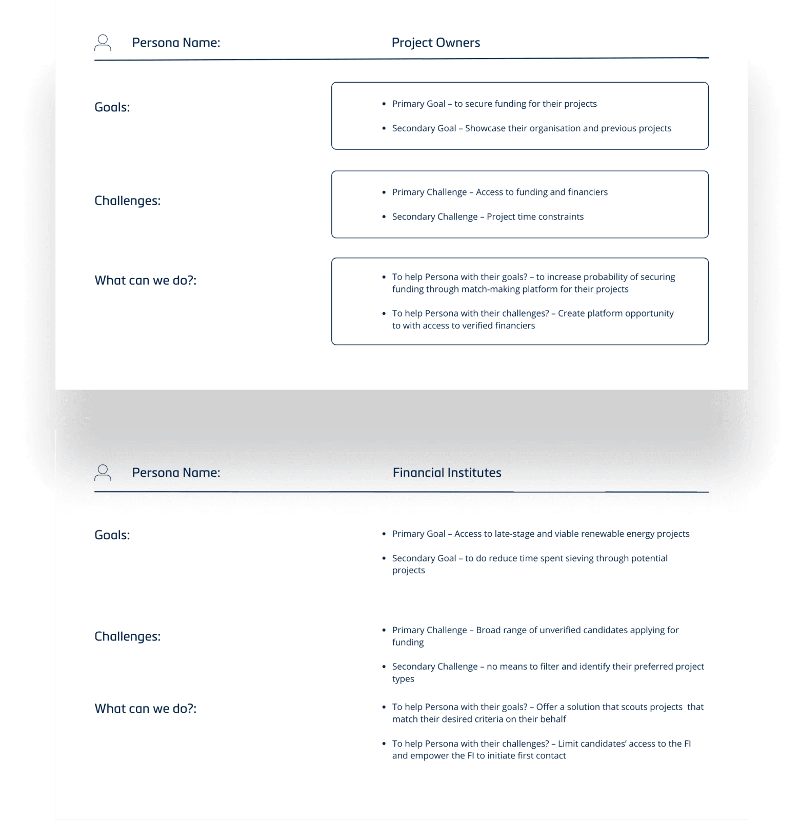 To build a match-making platform we needed to have a good understanding of our different user segments. We created personas to define the goals, needs, and experiences of renewable energy Project Owners and of Financial Institutions. The personas were based on detailed market research and data gathered through interviews during development of the MEPAF business plan by the client. We updated the personas throughout the project as we gathered more data and checked against them to keep the design aligned with the user goals.